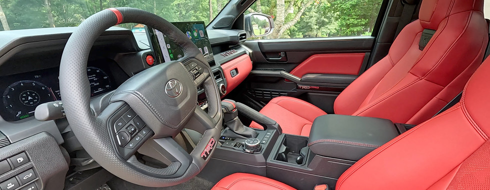 Inside… well, getting inside is the first challenge. With roughly 11.5 inches of ground clearance, the TRD Pro requires a big step up to get into the driver’s seat, which doesn’t come with any sort of a grab handle. Given that Toyota doesn’t want to limit the breakover angle, running boards or side steps are nonexistent. The trick IsoDynamic Performance seats also sport larger bolsters, which you need to maneuver around, and this contortionism almost always results in bonking your head on the doorframe or your knee on the dashboard or steering wheel when hoisting yourself into the truck. Much like a Lotus Elise, there is no way to gracefully get into the vehicle.